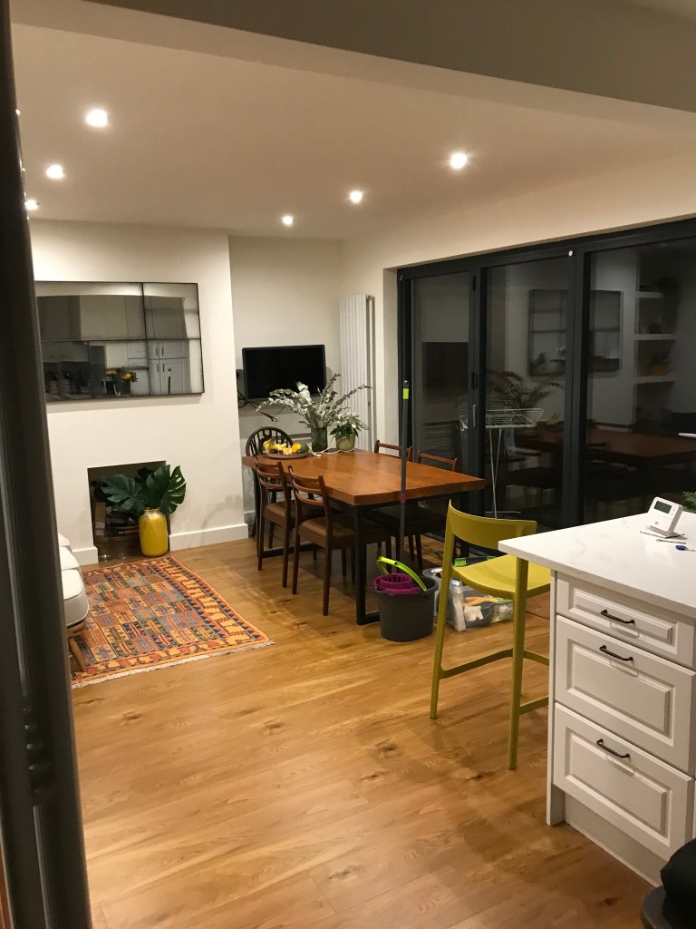 The rear window was removed and replaced with Aluminium tri-fold doors opening onto a newly installed patio. A stylish old banister was stripped and repainted / stained, restoring it to its original beauty. The kitchen was supplied and fitted by another firm with RBC carrying out all preparation work for the kitchen installation and tiling the space afterwards.