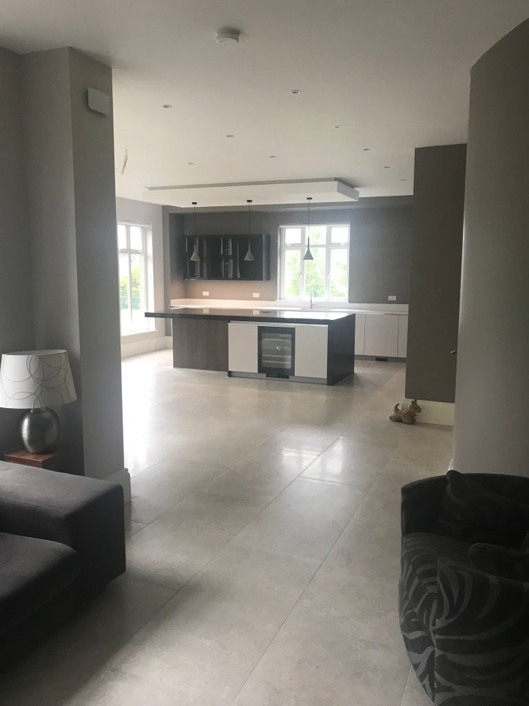 Dropped ceiling sections wrap the edges of the room, containing lighting and services keeping a clean, minimalist look which has been complimented by bespoke kitchen units. This luxurious space provides a wonderful living area which will be enjoyed in family home for many years to come.