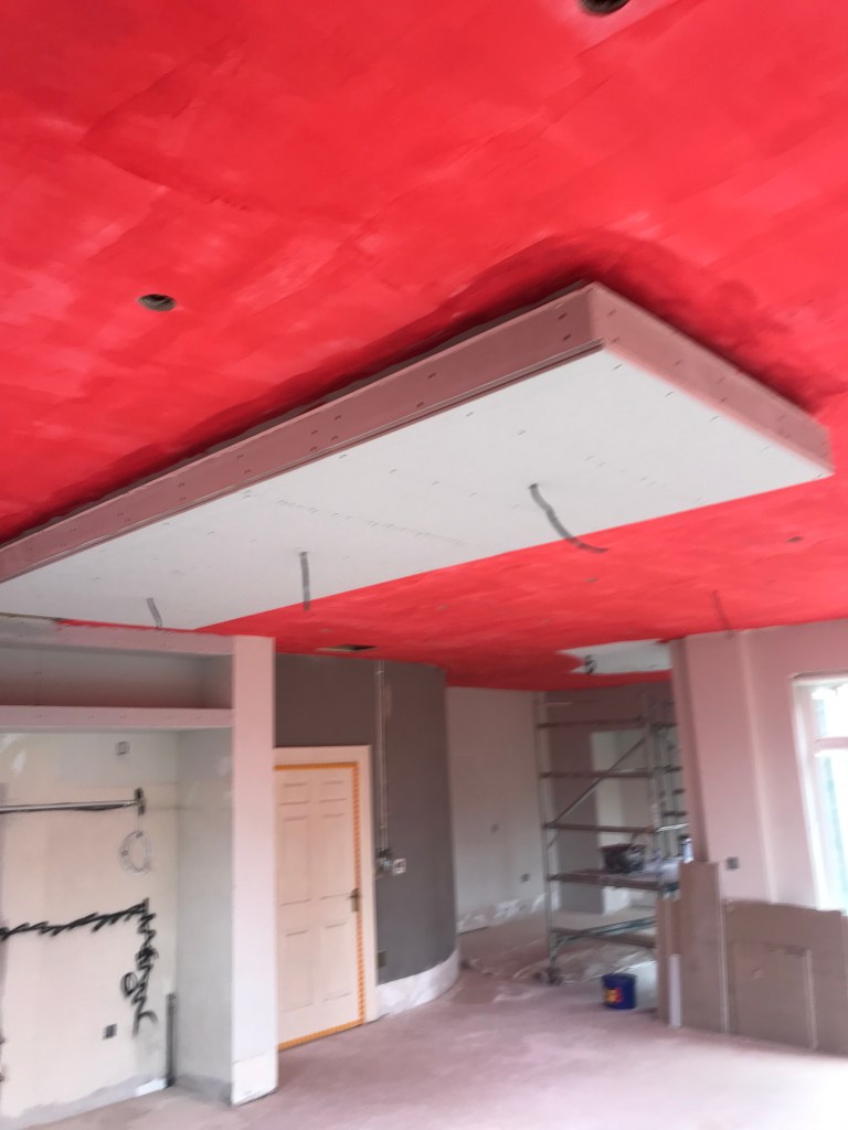 A dropped ceiling section with recessed lighting reflects the floor island. RBC carried out all the electrical and plumbing work, built the dropped ceiling and recesses for TV and entertainment wall, including tiling, painting,